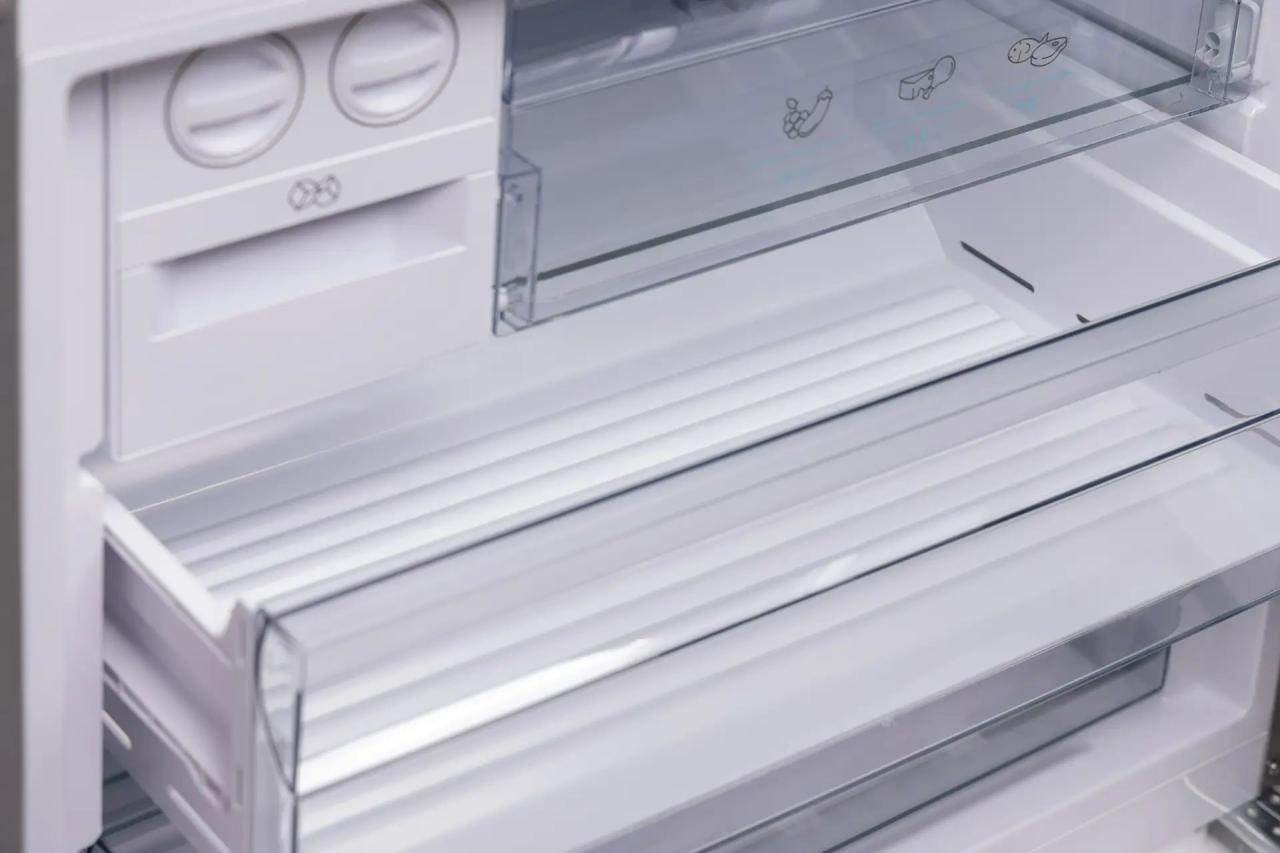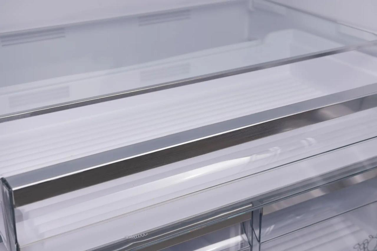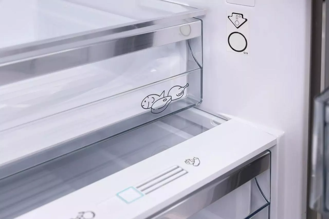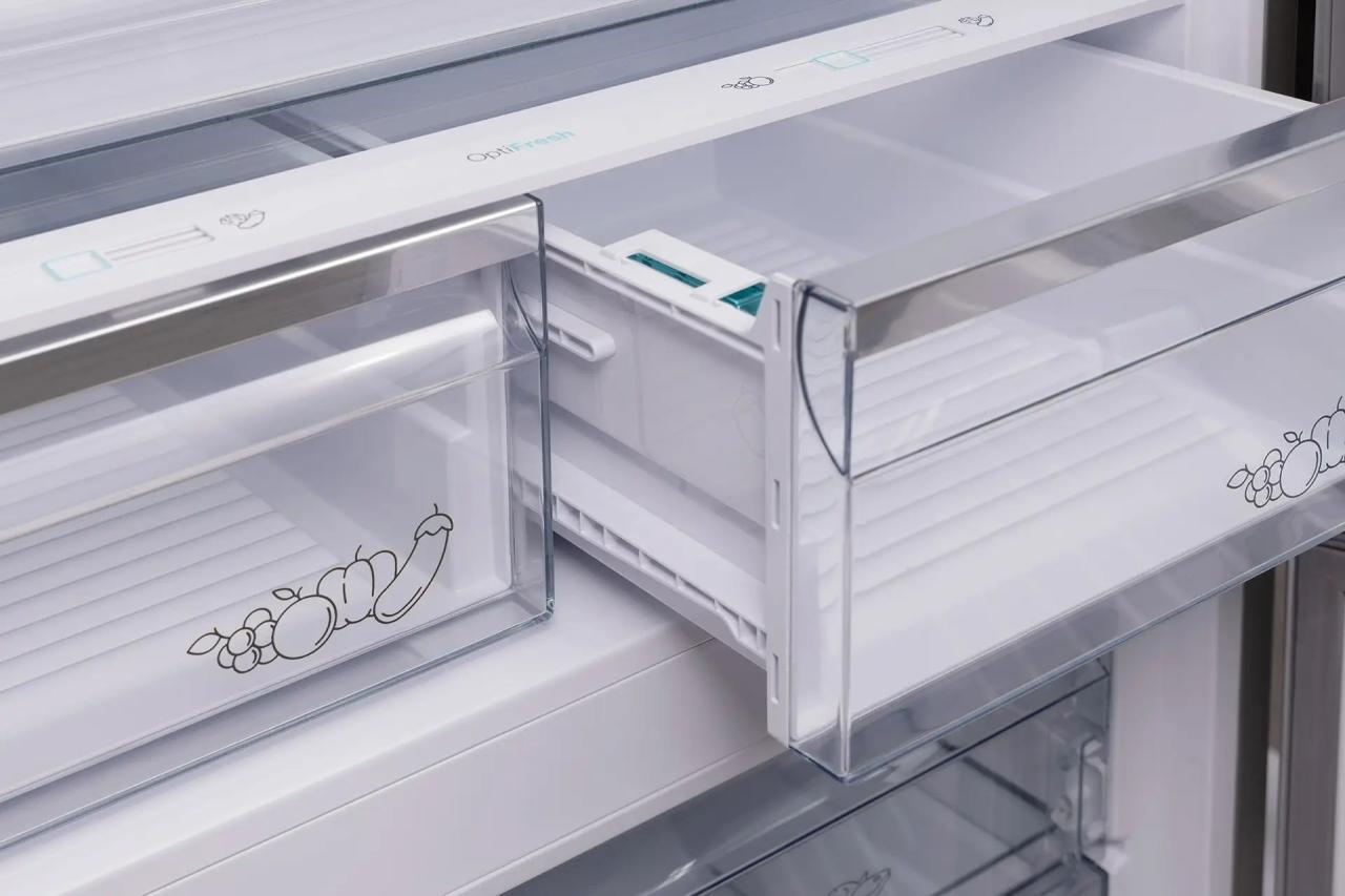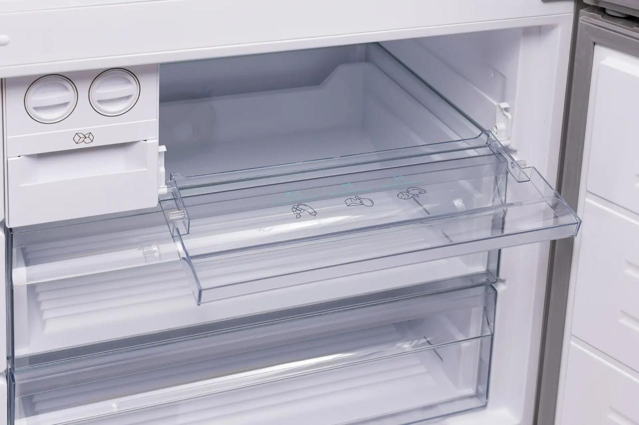 Управление режимами интуитивно понятно: здесь реализовано электронное управление с индикацией на большом LCD-дисплее и внешним сенсорным экраном, есть сигнал открытой двери. Внутри — регулируемые по высоте стеклянные полки, контейнер для фруктов и овощей, зона сохранения свежести и яркая внутренняя подсветка.