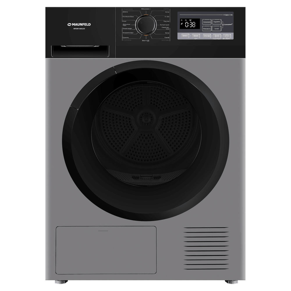 Сушильная машина с тепловым насосом обеспечивает бережную и экономичную сушку до 8 кг белья. Среди функций — датчик влажности, «Антисмятие», отложенный старт и подсветка барабана.