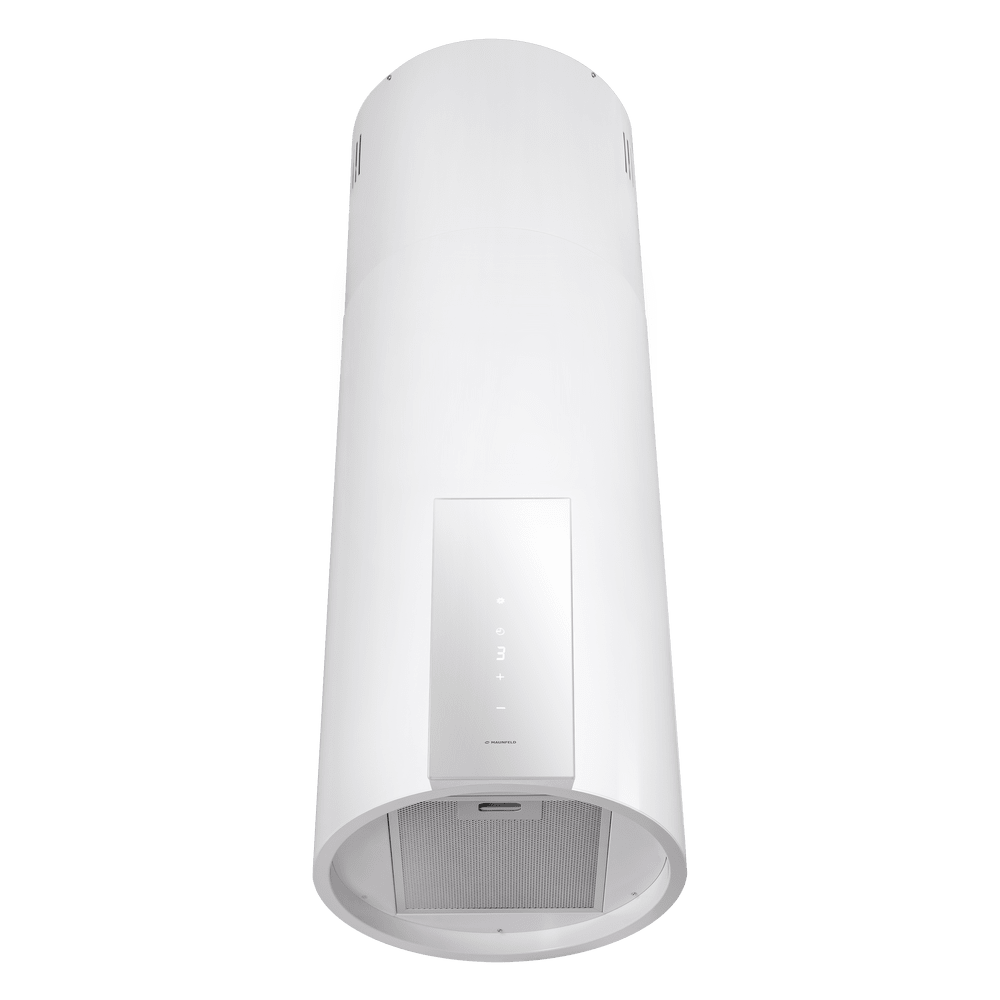 Кухонная вытяжка MAUNFELD ALBA 39 Isla белый — стильное решение для островной планировки и просторных кухонь. Цилиндрический корпус аккуратно крепится к потолку над варочной поверхностью и органично дополняет современный интерьер.