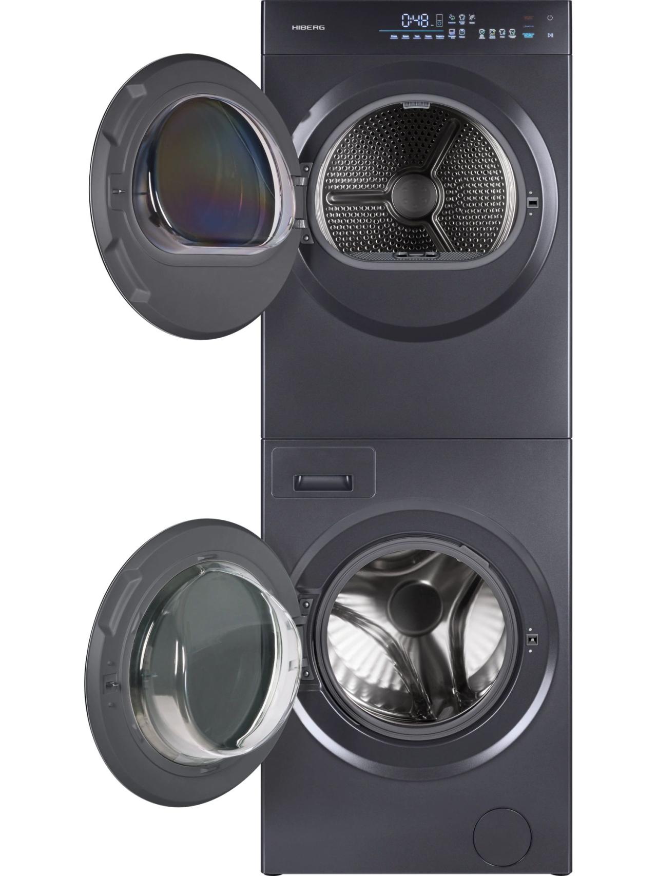 Монокомплект стиральной и сушильной машин темно-серого цвета с черными дверцами люков выполнен в современном дизайне. В верхней части устройства расположена интуитивно понятная сенсорная панель управления на цветном LED-дисплее. Индикация подскажет тип стирки, температуру, показатели сушки и полоскания, скорость, время, отложенный старт, защиту от детей, код ошибки, старт или паузу и дополнительные опции.