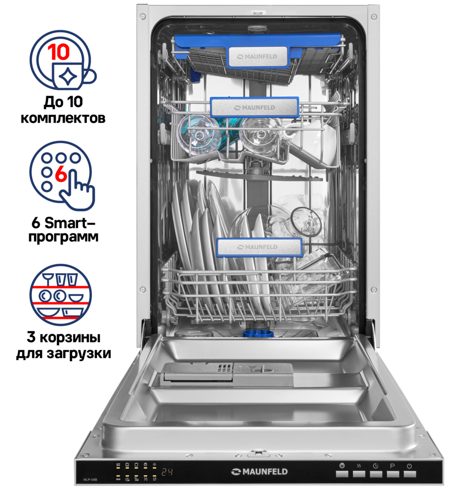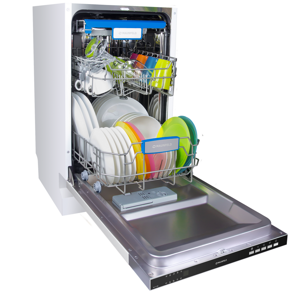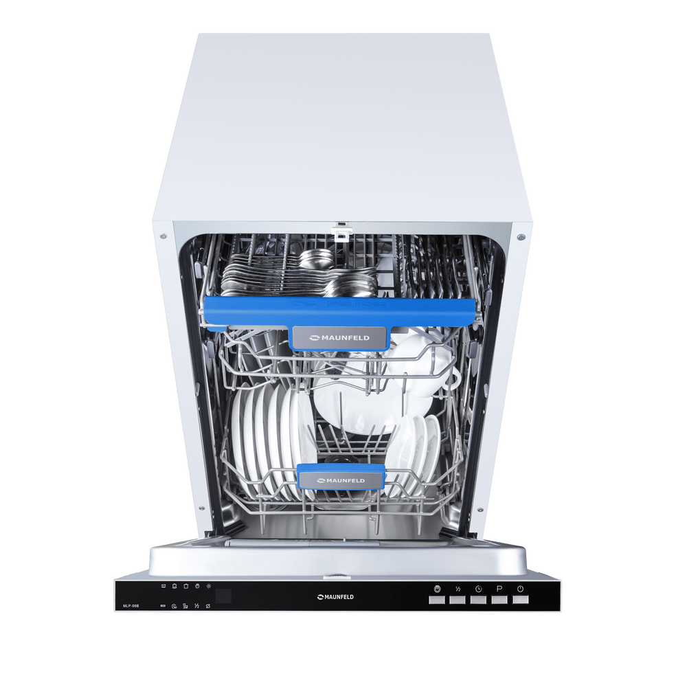 Узкая встраиваемая посудомоечная машина MAUNFELD MLP-08B станет удобным решением для кухни с ограниченным пространством. При ширине всего 45 см она вмещает 10 комплектов посуды, обеспечивая достаточную вместительность для семьи.