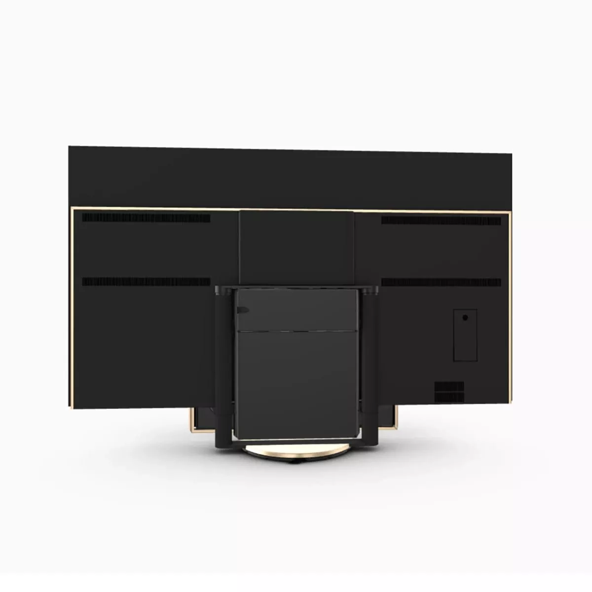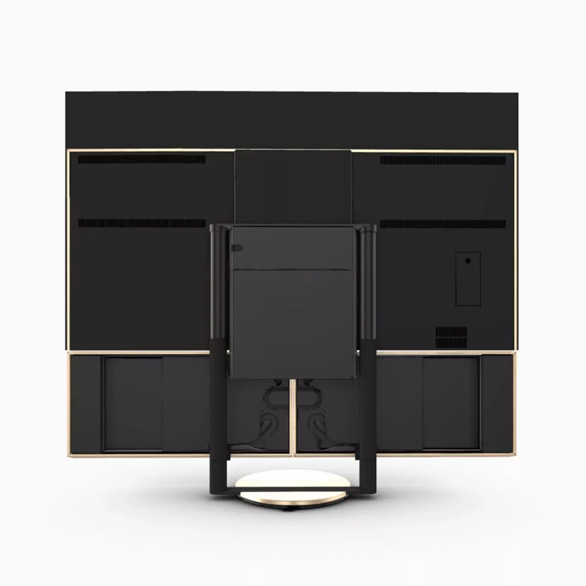 Экран телевизора в выключенном состоянии закрывает конструкция аудиосистемы. При включении экран автоматически приподнимается, а две части аудиосистемы поднимаются, как крылья бабочки, открывая экран.