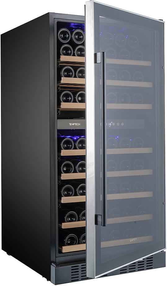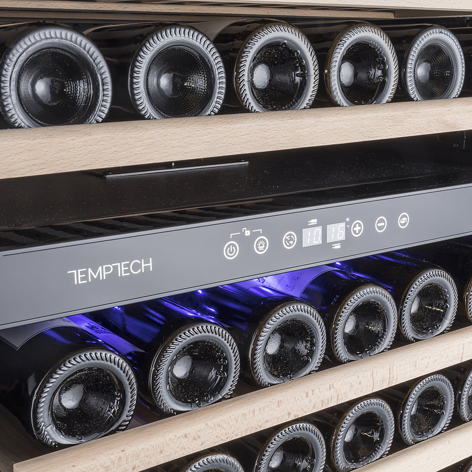 Винный шкаф Temptech WP120DCB вмещает до 94 винных бутылок в двух зонах охлаждения. В верхней зоне температура устанавливается в диапазоне 5-12°C, в нижней - 12-20°C. Сенсорный дисплей для настройки температуры находится на разделительной панели за дверцей шкафа.