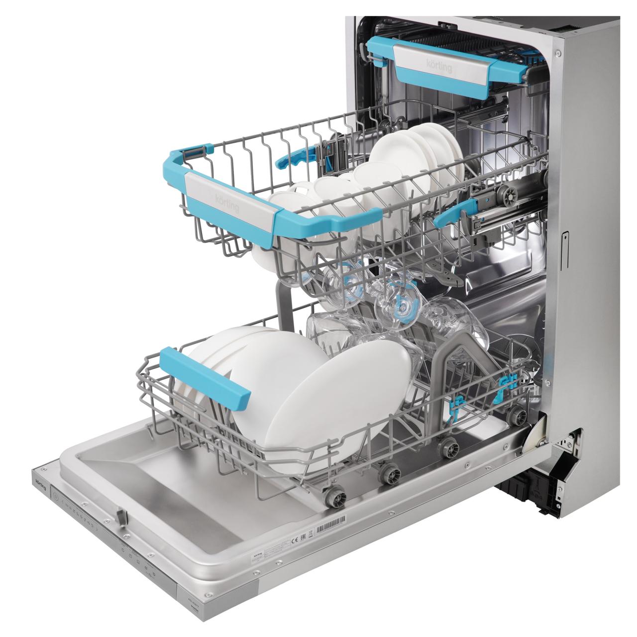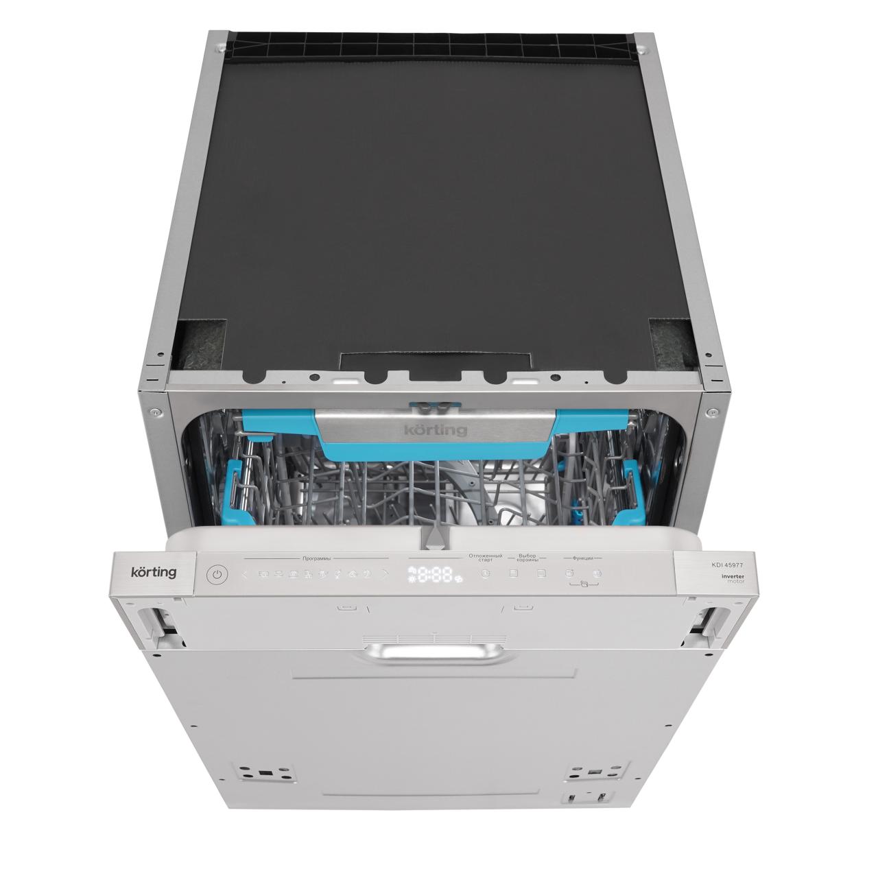 Встраиваемая посудомоечная машина Korting KDI 45977 представляет собой уникальное сочетание стильного дизайна и передовых технологий. Серебристая панель управления и внутреннее освещение LED придают ей современный и элегантный вид.