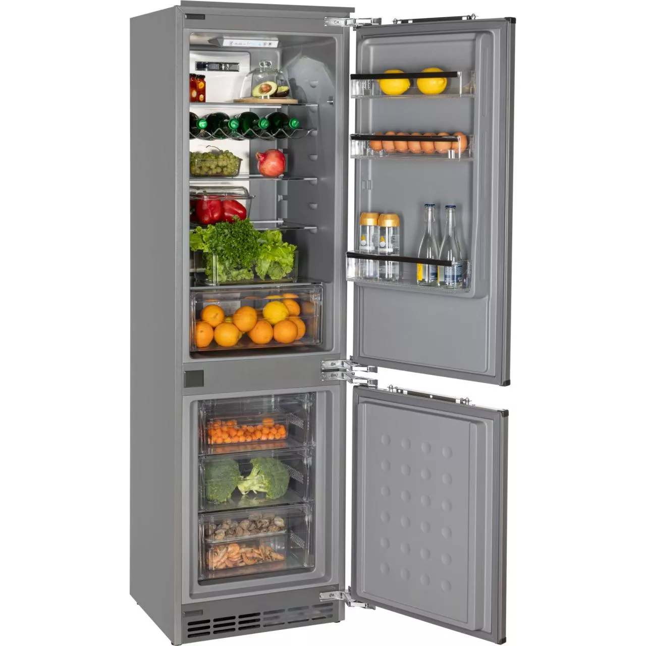 Встраиваемый холодильник HIBERG i-RFCB-400F NF с инверторным компрессором, автоматической системой охлаждения Total No Frost и электронным управлением — идеальный выбор для встраивания в кухонный гарнитур и создания комфортного пространства на кухне. Двери холодильника можно повесить на правую или левую сторону. Это позволяет открывать их в удобном направлении и устанавливать технику в любом месте. Корпус, как и внутренняя часть модели стильного серого цвета.