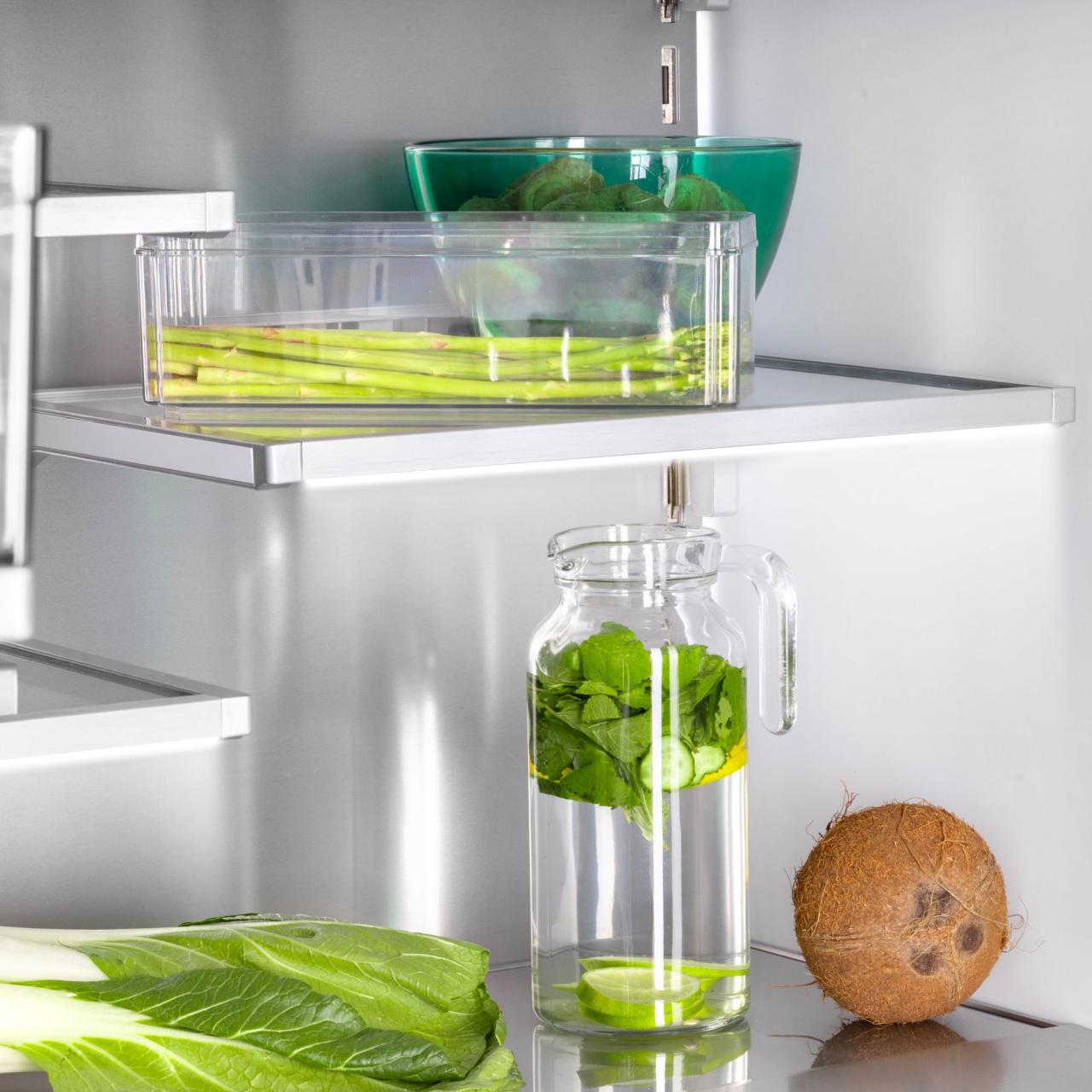 Продуманная внутренняя эргономика холодильника делает хранение продуктов максимально удобным. Все ящики модели оснащены направляющими и доводчиками, открываются легким нажатием, в дверях холодильной и морозильной камер также предусмотрены доводчики. Полки холодильного и морозильного отделений имеют LED-подсветку, что обеспечивает отличный обзор продуктов.