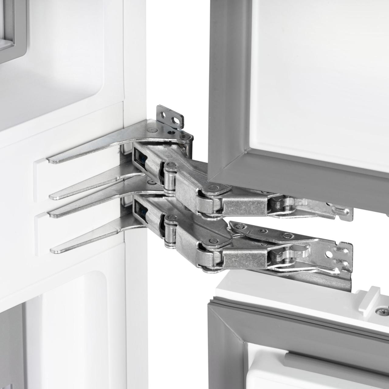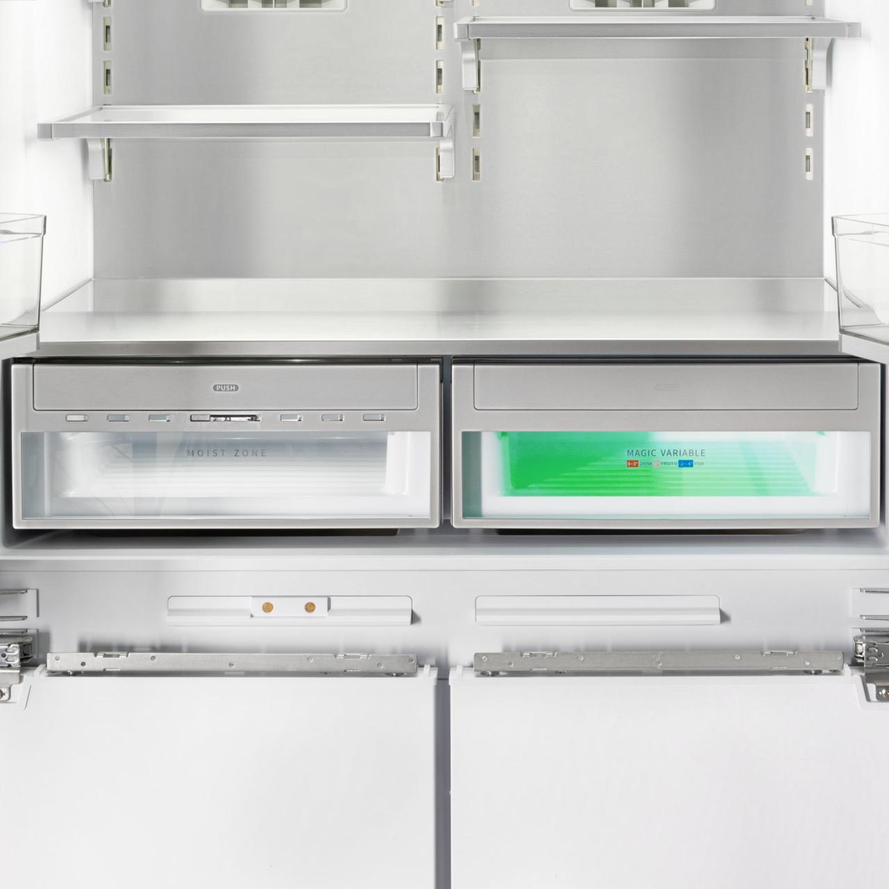 Благодаря четырехдверной конструкции и открыванию дверь в дверь пользователь получает доступ к продуктам, не выпуская при этом холод из остальной части холодильника. Модель имеет жесткую систему крепления фасадов: они не связаны с корпусом шкафа, не предполагают наличие дополнительных петель. Холодильник имеет неограниченный угол открывания, отсутствуют зазоры, в которых могут скапливаться загрязнения.